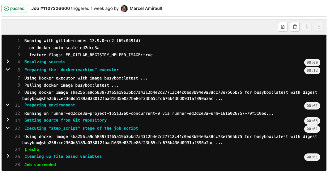 - echo 'this line should be hidden automatically after loading the job log'