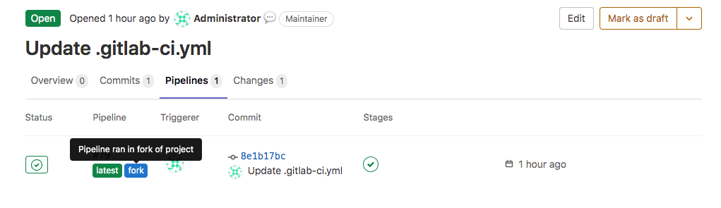 After a merge request is open on the branch, the pipeline switches to a merge request pipeline.