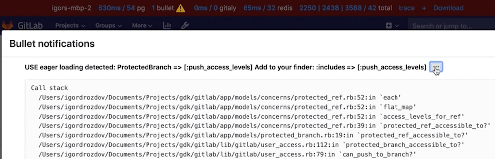 Bullet is a Gem that can be used to track down N+1 query problems. It logs query problems to the Rails log and the browser console. The Bullet section is displayed on the performance bar.