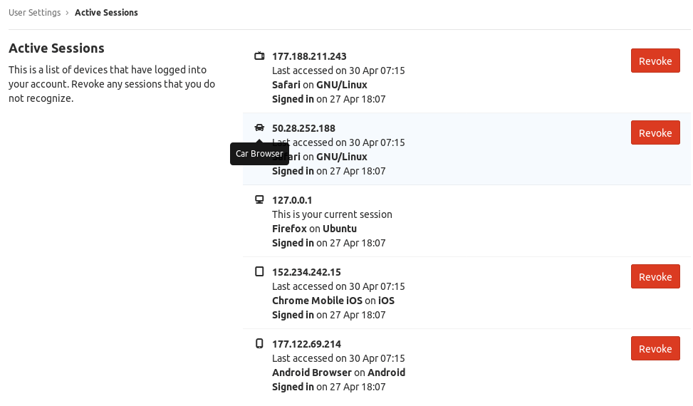 - Select Revoke next to a session. The current session cannot be revoked, as this would sign you out of GitLab.