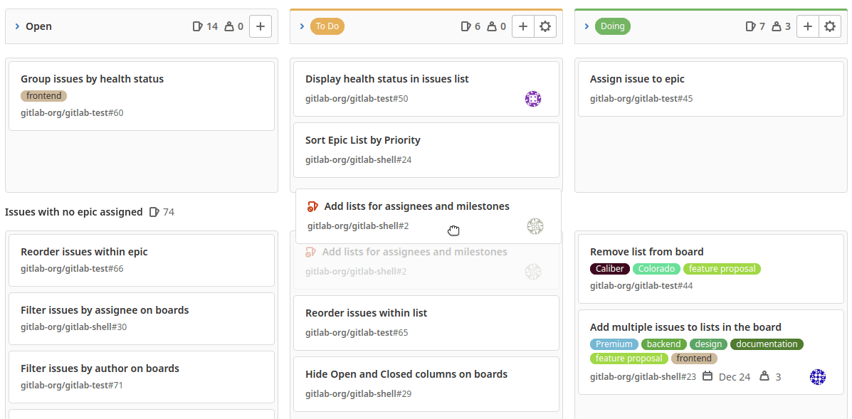 With multiple issue boards, each team has one board. Now you can move issues through each part of the process. For example: To Do, Doing, and Done.