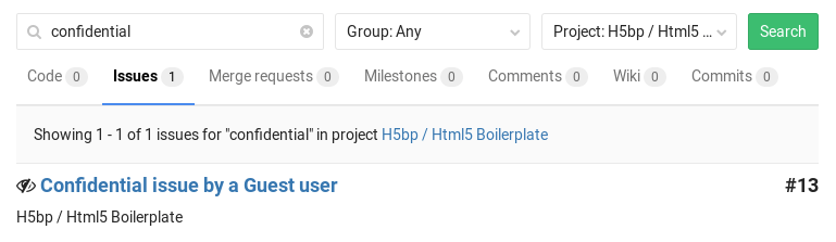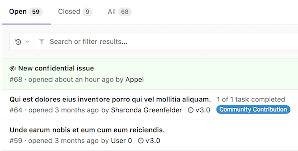 Confidential issues are visually different from regular issues in a few ways. In the issues index page view, you can see the confidential ({eye-slash}) icon next to the issues that are marked as confidential: