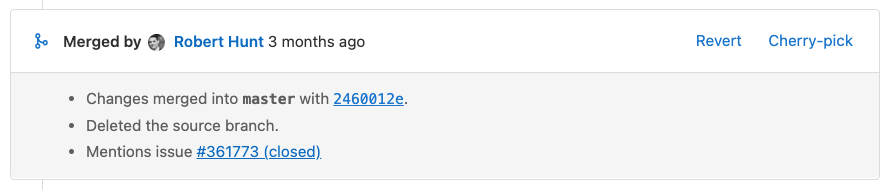 When you cherry-pick a merge commit in the GitLab UI or API, GitLab adds a system note