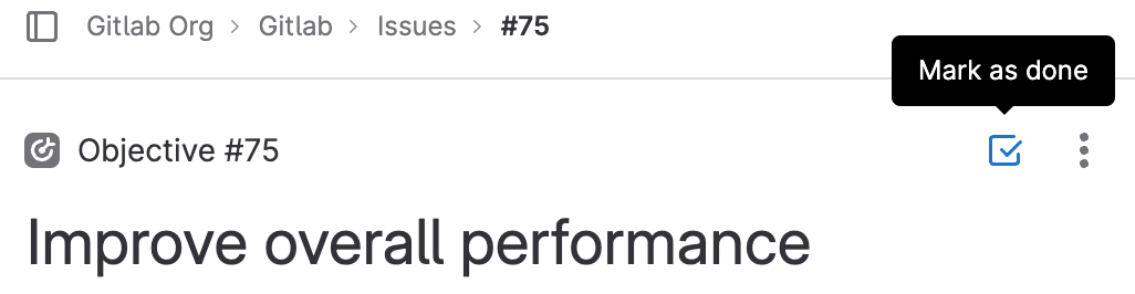 In the upper-right corner of the resource (for example, issue or merge request), select Mark as done ({todo-done}).